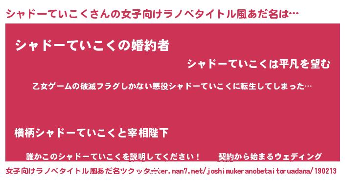 | 男性向けラノベタイトル風あだ名 | 『魔弾の王とシャドーていこく』 |