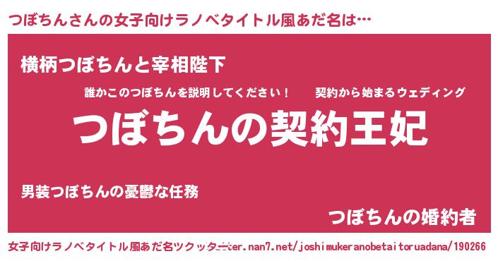 つぼちんさんの女子向けラノベタイトル風あだ名は… 『つぼちんの契約王妃』『横柄つぼちんと宰相陛下』『つぼちんの婚約者』 ツクッター #女子向けラノベタイトル風あだ名ツクッター http://tkutter.nan7.net/joshimukeranobetaitoruadana/190266/