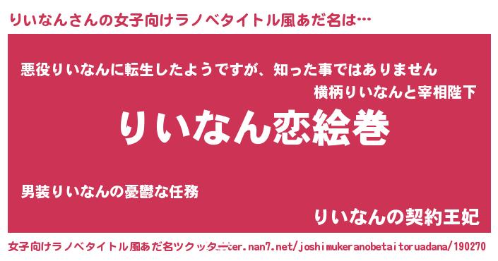 りいなんさんの女子向けラノベタイトル風あだ名は… 『りいなん恋絵巻』『悪役りいなんに転生したようですが、知った事ではありません』『りいなんの契約王妃』 ツクッター #女子向けラノベタイトル風あだ名ツクッター http://tkutter.nan7.net/joshimukeranobetaitoruadana/190270/