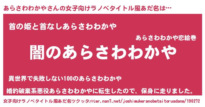 | 男性向けラノベタイトル風あだ名 | 『Re:あらさわわかやから始める異世界生活』 |