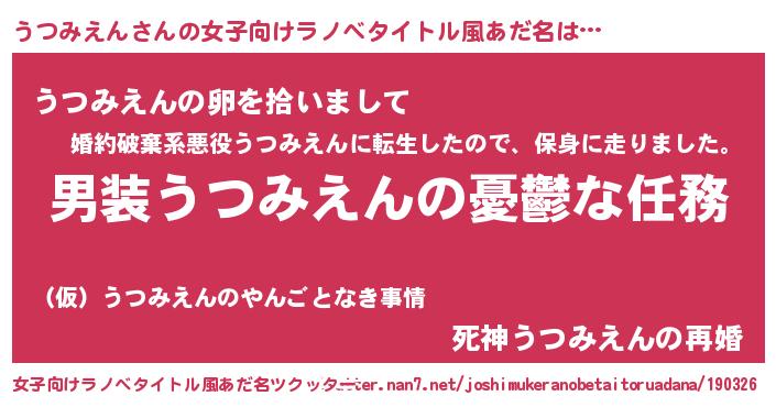 | 男性向けラノベタイトル風あだ名 | 『うちのうつみえんが世界を掌握している!』 |