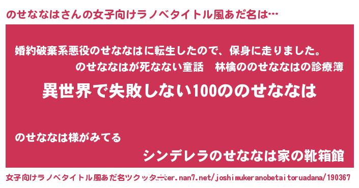 | 男性向けラノベタイトル風あだ名 | 『のせななはという概念が存在しない退屈な世界 』 |