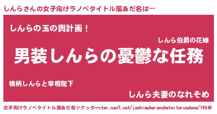 | 男性向けラノベタイトル風あだ名 | 『冴えないしんらの育てかた』 |