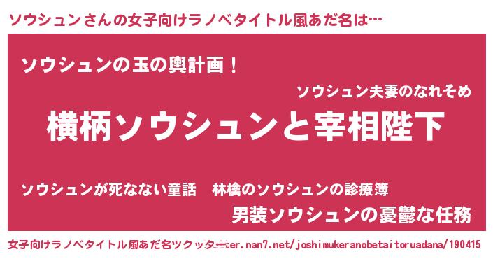 | 男性向けラノベタイトル風あだ名 | 『ソウシュンに滅ぼされるだけの簡単なお仕事です』 |