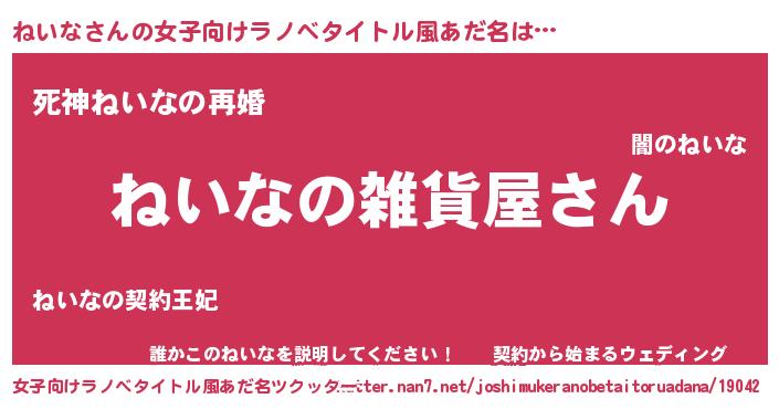 | 男性向けラノベタイトル風あだ名 | 『やはりねいなの青春ラブコメはまちがっている 』 |
