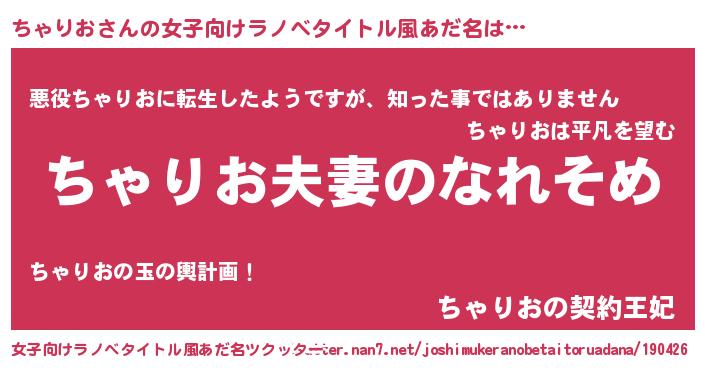 | 男性向けラノベタイトル風あだ名 | 『おまえをオタクにしてやるから、俺をちゃりおにしてくれ! 』 |