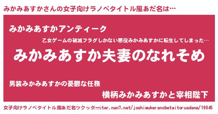 | 男性向けラノベタイトル風あだ名 | 『おまえをオタクにしてやるから、俺をみかみあすかにしてくれ! 』 |