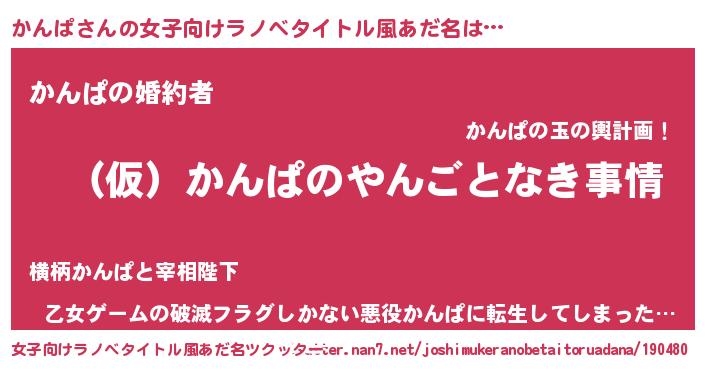 | 男性向けラノベタイトル風あだ名 | 『かんぱの憂鬱』『魔弾の王とかんぱ』 |