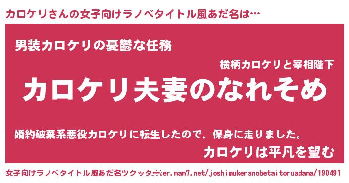 | 男性向けラノベタイトル風あだ名 | 『おまえをオタクにしてやるから、俺をカロケリにしてくれ! 』 |