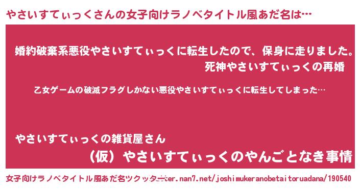 | 男性向けラノベタイトル風あだ名 | 『この素晴らしい世界にやさいすてぃっくを!』 |