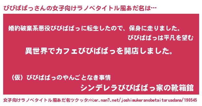 | 男性向けラノベタイトル風あだ名 | 『誰もが恐れるあのびびばばっが、ぼくの専属メイドになるようです。』 |