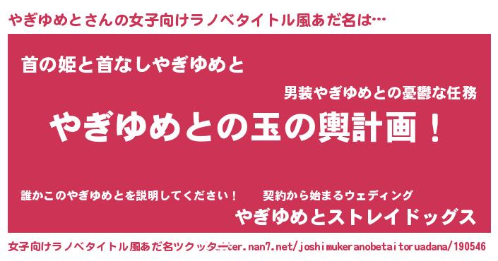 | 男性向けラノベタイトル風あだ名 | 『やぎゆめと~年齢イコール彼女いない歴の魔法使い~』 |