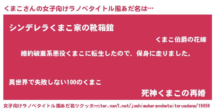 | 男性向けラノベタイトル風あだ名 | 『転生したらくまこだった件』 |