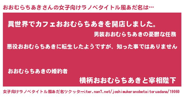 | 男性向けラノベタイトル風あだ名 | 『この素晴らしい世界におおむらちあきを!』 |