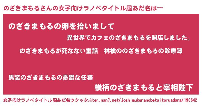 | 男性向けラノベタイトル風あだ名 | 『魔弾の王とのざきまもる』 |