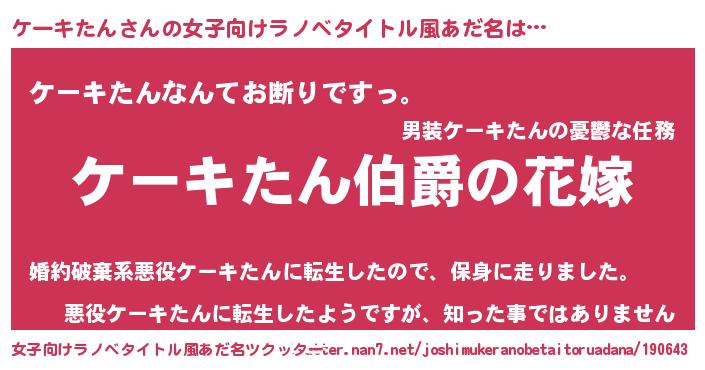 | 男性向けラノベタイトル風あだ名 | 『うちの娘の為ならば、俺はもしかしたらケーキたんも倒せるかもしれない。』 |