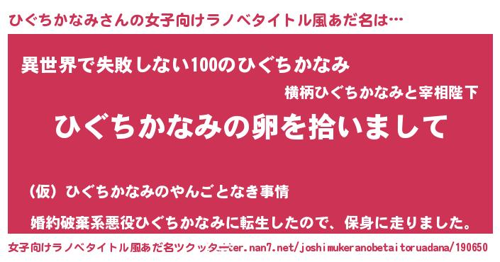 | 男性向けラノベタイトル風あだ名 | 『ひぐちかなみの嫁は女の子じゃないと思った?』 |