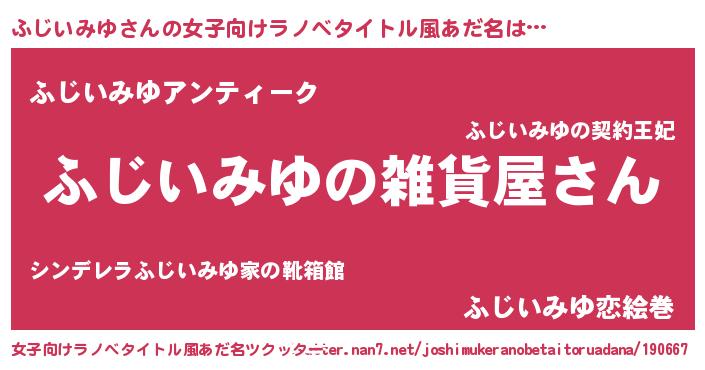 ふじいみゆさんの女子向けラノベタイトル風あだ名は… 『ふじいみゆの雑貨屋さん』『ふじいみゆアンティーク』『ふじいみゆ恋絵巻』 ツクッター #女子向けラノベタイトル風あだ名ツクッター http://tkutter.nan7.net/joshimukeranobetaitoruadana/190667/