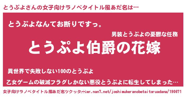 | 男性向けラノベタイトル風あだ名 | 『うちの娘の為ならば、俺はもしかしたらとうぷよも倒せるかもしれない。』 |