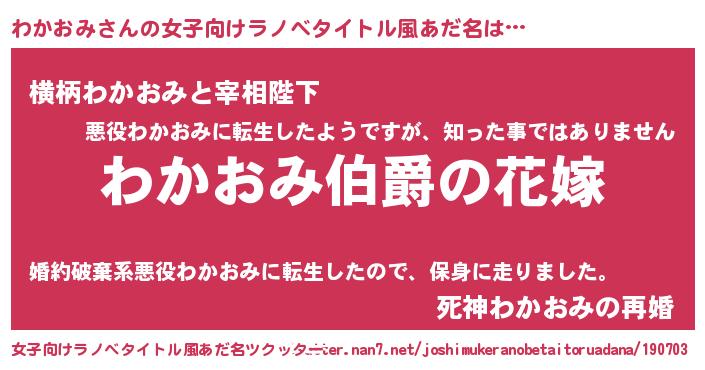 | 男性向けラノベタイトル風あだ名 | 『うちの娘の為ならば、俺はもしかしたらわかおみも倒せるかもしれない。』 |