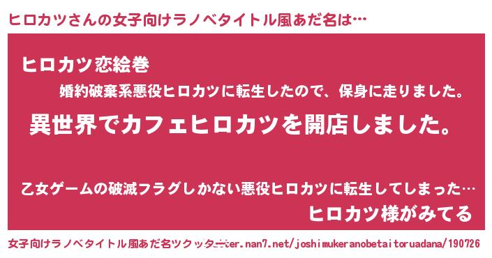| 男性向けラノベタイトル風あだ名 | 『誰もが恐れるあのヒロカツが、ぼくの専属メイドになるようです。』 |