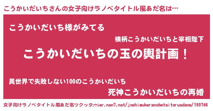 | 男性向けラノベタイトル風あだ名 | 『こうかいだいち~年齢イコール彼女いない歴の魔法使い~』 |