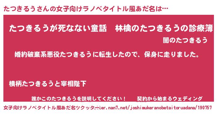 | 男性向けラノベタイトル風あだ名 | 『転生したらたつきるうだった件』 |