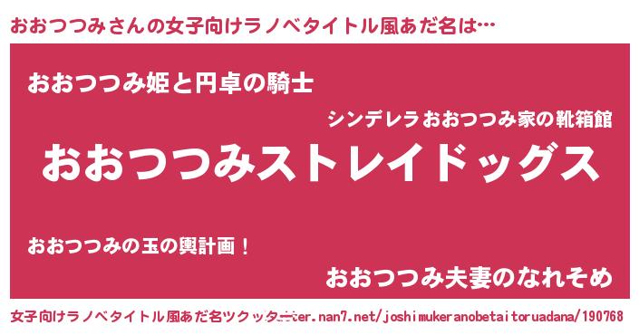 | 男性向けラノベタイトル風あだ名 | 『Re:おおつつみから始める異世界生活』 |