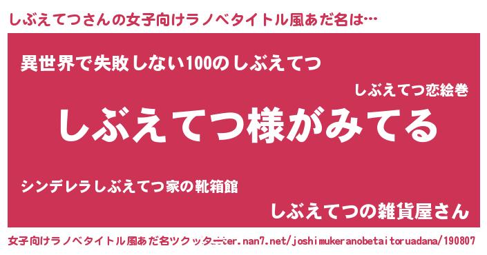 | 男性向けラノベタイトル風あだ名 | 『しぶえてつの嫁は女の子じゃないと思った?』 |