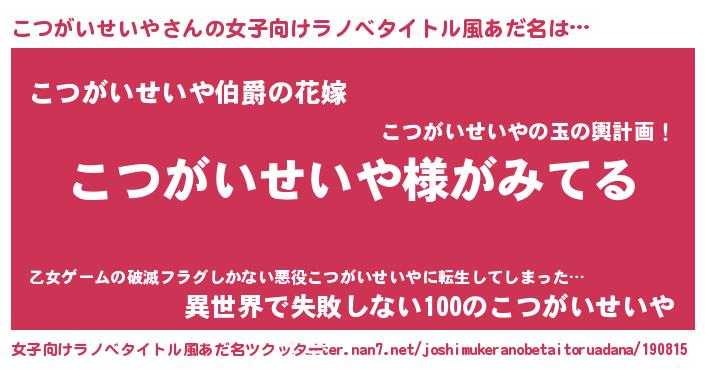 | 男性向けラノベタイトル風あだ名 | 『こつがいせいやの嫁は女の子じゃないと思った?』 |