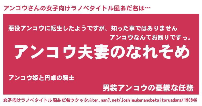 | 男性向けラノベタイトル風あだ名 | 『おまえをオタクにしてやるから、俺をアンコウにしてくれ! 』 |