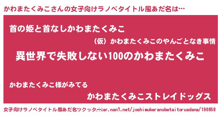 | ヒーロー風カッコイイあだ名 | 『ネオカワマタクミコ』『幻影騎士カワ』 |