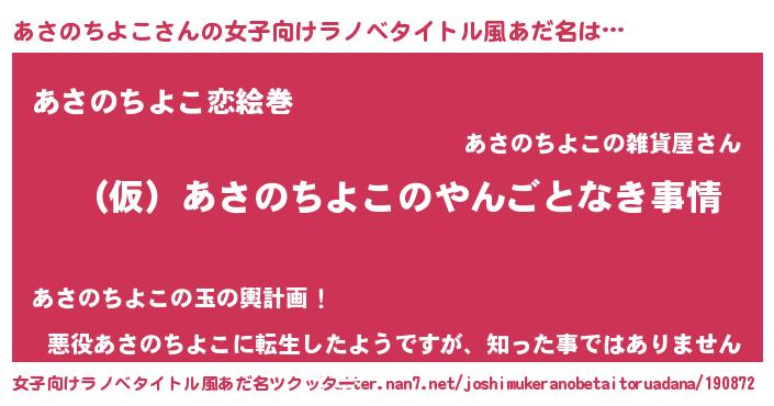 | 肩書あだ名 | 『あさのちよこ店長』『あさのちよこ教官』 |