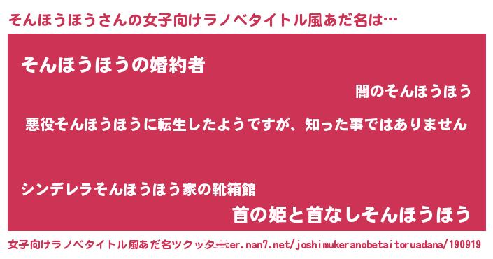 | 男性向けラノベタイトル風あだ名 | 『この素晴らしい世界にそんほうほうを!』 |