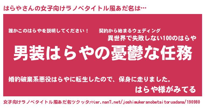 | 男性向けラノベタイトル風あだ名 | 『うちのはらやが世界を掌握している!』 |