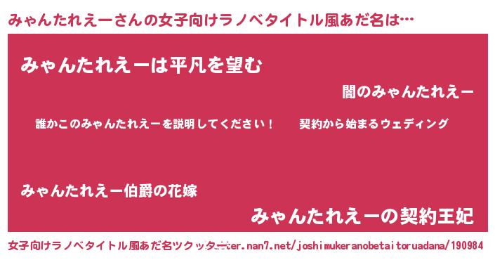 | 男性向けラノベタイトル風あだ名 | 『ミャンタレエーアートオンライン』 |