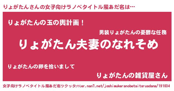 | 男性向けラノベタイトル風あだ名 | 『おまえをオタクにしてやるから、俺をりょがたんにしてくれ! 』 |