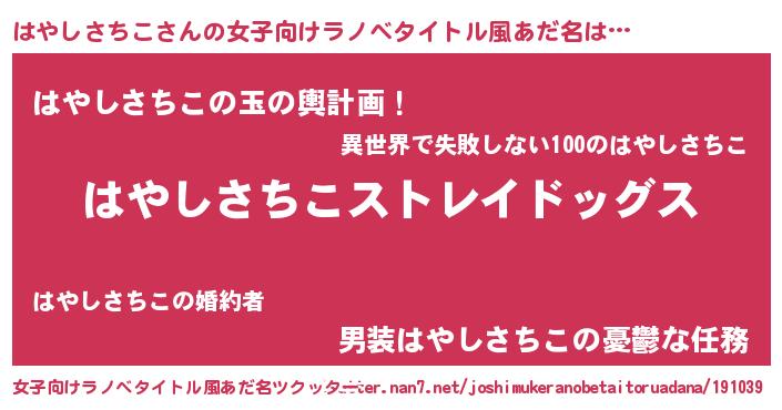 | 男性向けラノベタイトル風あだ名 | 『Re:はやしさちこから始める異世界生活』 |