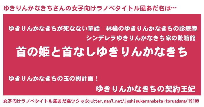 | 男性向けラノベタイトル風あだ名 | 『はたらくゆきりんかなきちさま!』 |