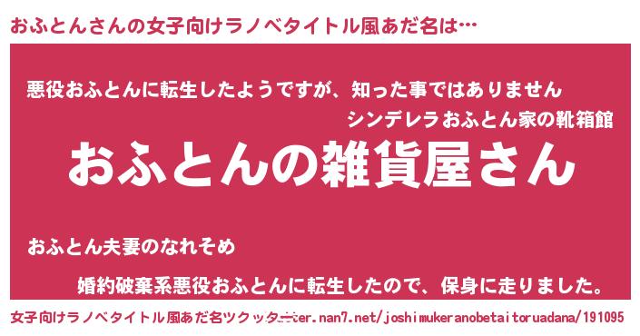 | 男性向けラノベタイトル風あだ名 | 『やはりおふとんの青春ラブコメはまちがっている 』 |