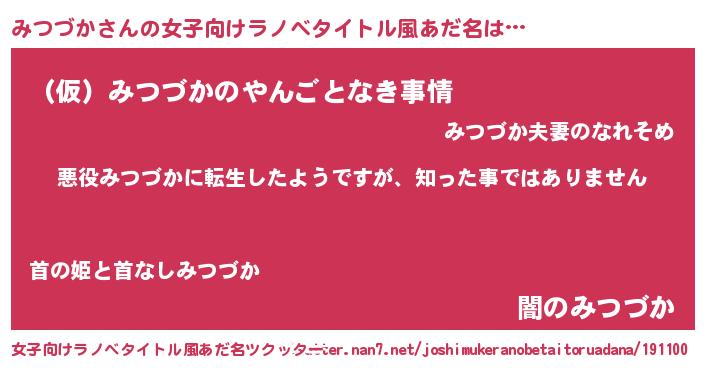 | 男性向けラノベタイトル風あだ名 | 『この素晴らしい世界にみつづかを!』 |