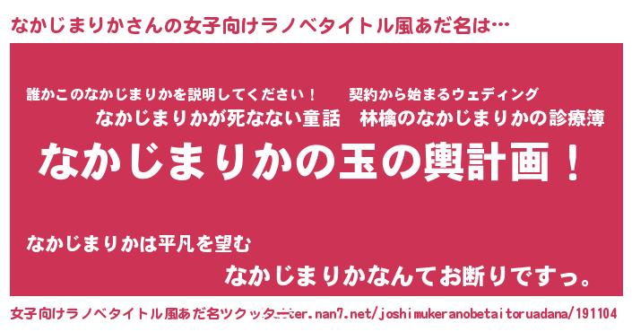 | 男性向けラノベタイトル風あだ名 | 『なかじまりか~年齢イコール彼女いない歴の魔法使い~』 |