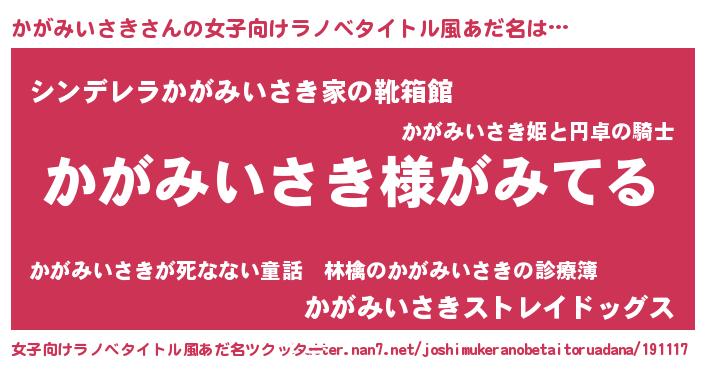 | 男性向けラノベタイトル風あだ名 | 『かがみいさきの嫁は女の子じゃないと思った?』 |