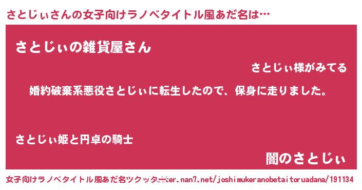 さとじぃさんの女子向けラノベタイトル風あだ名は… 『婚約破棄系悪役さとじぃに転生したので、保身に走りました。』『さとじぃの雑貨屋さん』『闇のさとじぃ』 ツクッター #女子向けラノベタイトル風あだ名ツクッター http://tkutter.nan7.net/joshimukeranobetaitoruadana/191134/