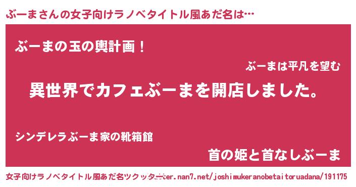 ぶーまさんの女子向けラノベタイトル風あだ名は… 『異世界でカフェぶーまを開店しました。』『ぶーまの玉の輿計画!』『首の姫と首なしぶーま』 ツクッター #女子向けラノベタイトル風あだ名ツクッター http://tkutter.nan7.net/joshimukeranobetaitoruadana/191175/