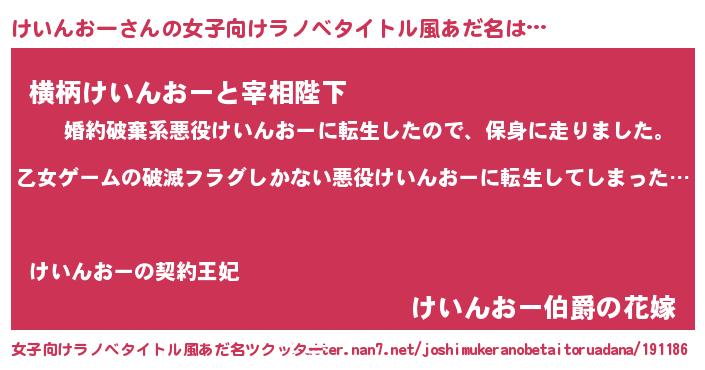 | 男性向けラノベタイトル風あだ名 | 『この素晴らしい世界にけいんおーを!』 |