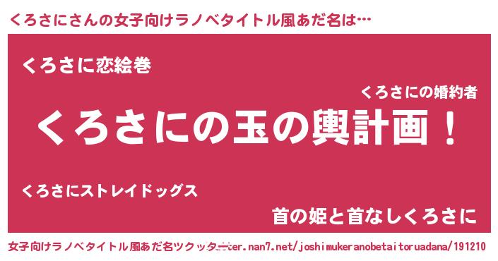 | 男性向けラノベタイトル風あだ名 | 『くろさに~年齢イコール彼女いない歴の魔法使い~』 |