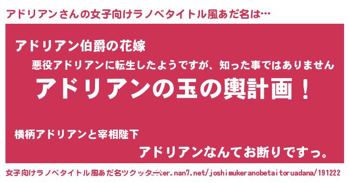 | 男性向けラノベタイトル風あだ名 | 『転生したらアドリアンだった件』 |