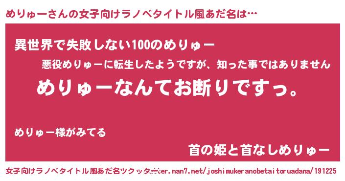 | 男性向けラノベタイトル風あだ名 | 『魔法科高校のめりゅー』 |