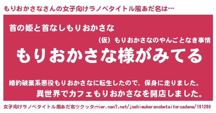 | 男性向けラノベタイトル風あだ名 | 『もりおかさなの嫁は女の子じゃないと思った?』 |